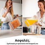 Χάρη στη σιλικόνη στο εσωτερικό του καπακιού, το δοχείο είναι απόλυτα αεροστεγές. Επομένως, υγρά ή χυμοί μέσα στο δοχείο δεν μπορούν να διαρρεύσουν ή να χυθούν, ακόμα και όταν μετακινείτε τα δοχεία, και τα τρόφιμα παραμένουν φρέσκα για περισσότερο.