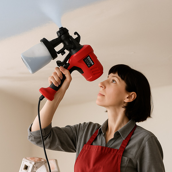 Το ειδικό ακροφύσιο παράγει μια λεπτή ομίχλη χρώματος που κάθεται ομοιόμορφα, χωρίς γραμμές ή μπαλώματα. Το εργαλείο δημιουργεί την αίσθηση ότι κάθε περιοχή βάφεται μόνη της “όπως πρέπει”, ανεξάρτητα από το υλικό, την εμπειρία του χρήστη ή την κατεύθυνση της κίνησης.