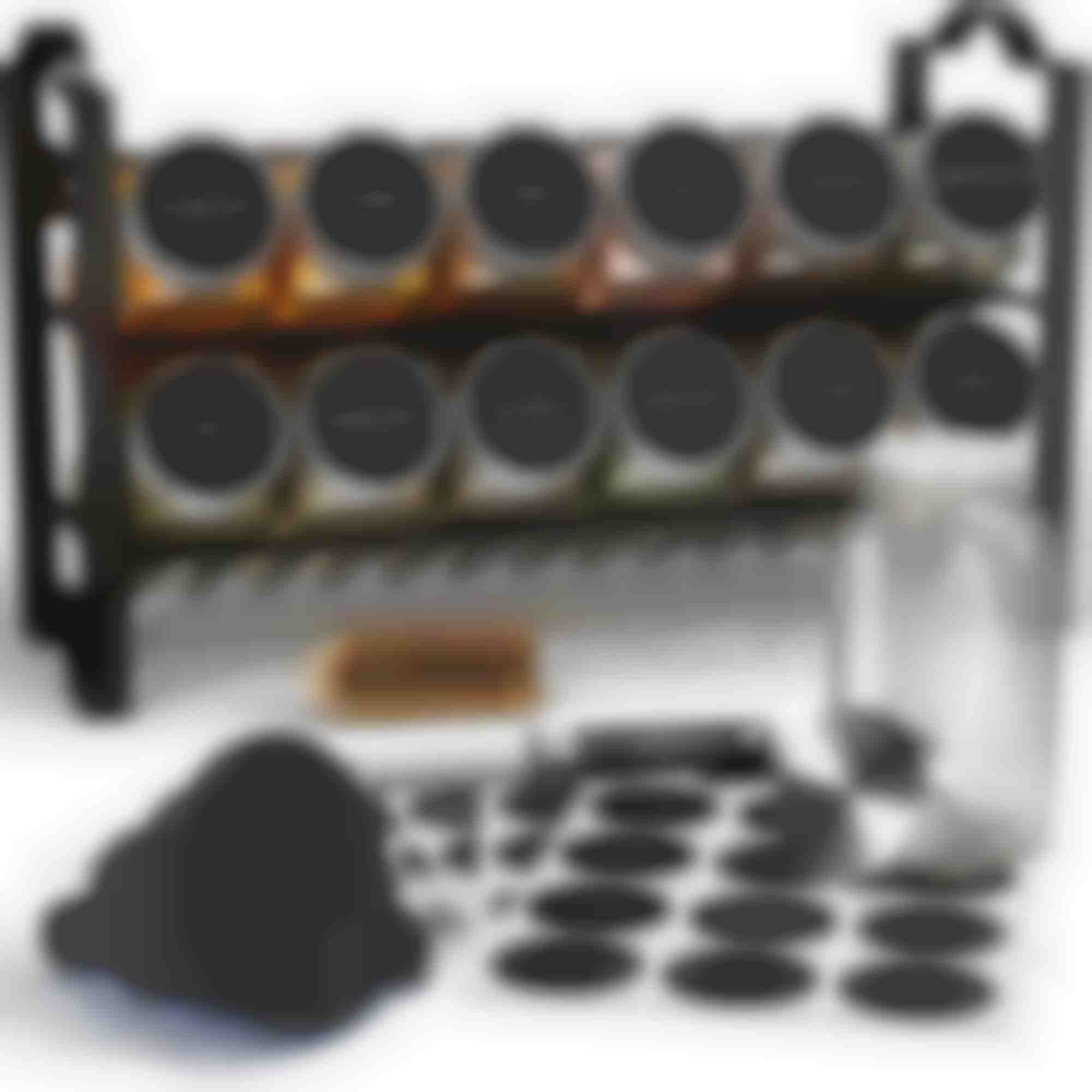 - Οργανώστε την κουζίνα σας – αυτό το σετ περιλαμβάνει ένα ράφι μπαχαρικών, αυτοκόλλητα μαξιλαράκια, 12 βάζα, 48 ετικέτες, ένα πινέλο, ένα στυλό κιμωλίας, δύο καπάκια σέικερ, ένα χωνί και υλικό στερέωσης.