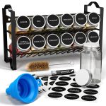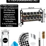 - Οργανώστε την κουζίνα σας – αυτό το σετ περιλαμβάνει ένα ράφι μπαχαρικών, αυτοκόλλητα μαξιλαράκια, 12 βάζα, 48 ετικέτες, ένα πινέλο, ένα στυλό κιμωλίας, δύο καπάκια σέικερ, ένα χωνί και υλικό στερέωσης.