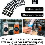 🫙 Περιλαμβάνει 48 ετικέτες, στυλό κιμωλίας και χωνί.