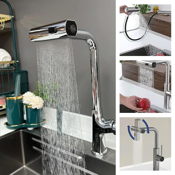 Η πολυχρηστική βρύση κουζίνας μας περιλαμβάνει μια περιστρεφόμενη κατά 360° έξοδο νερού υψηλής πίεσης, η οποία όχι μόνο εξαλείφει το πιτσίλισμα αλλά και ενισχύει τη ροή του νερού, καθιστώντας το πλύσιμο και το ξέβγαλμα πιο αποτελεσματικό και διαχειρίσιμο.