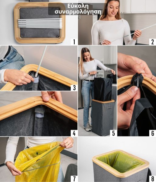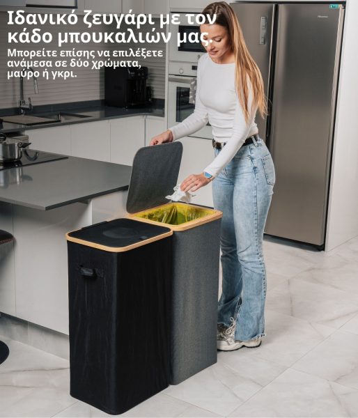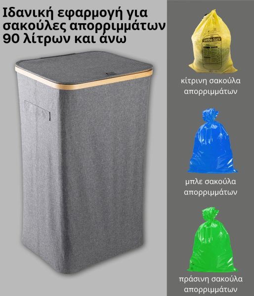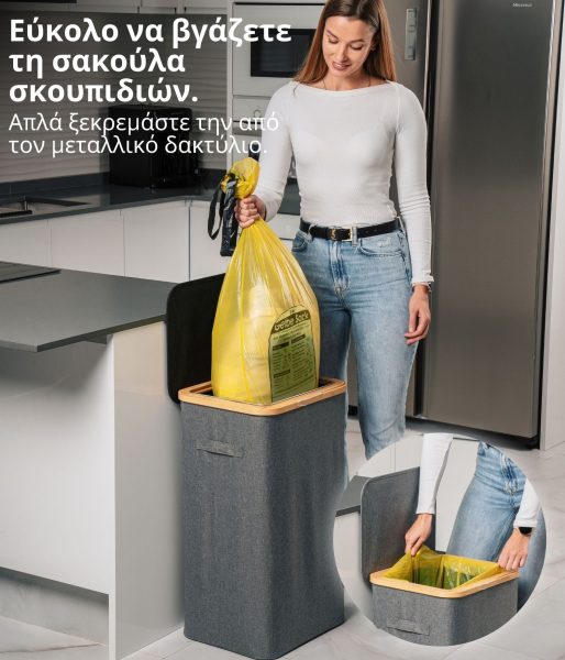Αυτό το μοντέλο διαθέτει ενισχυμένες ραφές, ανθεκτικά υλικά και ένα αισθητικά εκλεπτυσμένο γκρι χρώμα που ταιριάζει άψογα σε κάθε χώρο – είτε πρόκειται για ένα μοντέρνο γραφείο είτε για μια μινιμαλιστική κουζίνα. Ο συμπαγής αλλά ευρύχωρος σχεδιασμός του επιτρέπει την αποτελεσματική ανακύκλωση χωρίς να καταλαμβάνει πολύ χώρο. Επιπλέον, ο κάδος διαθέτει πλαίσιο από μπαμπού με σιδερένιο δακτύλιο στον οποίο προσαρμόζεται η σακούλα απορριμμάτων, καθιστώντας εύκολη την αλλαγή και τη χρήση του. Ο κάδος είναι σχεδιασμένος για σακούλες απορριμμάτων χωρητικότητας 90 λίτρων, αλλά μπορείτε εύκολα να χρησιμοποιήσετε μεγαλύτερες.