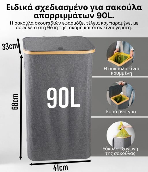 - ΧΩΡΗΤΙΚΌΤΗΤΑ 90 ΛΊΤΡΩΝ: Ειδικά σχεδιασμένη για κίτρινες σακούλες 90 λίτρων, αλλά κατάλληλη και για άλλες σακούλες απορριμμάτων ίδιας ή μεγαλύτερης χωρητικότητας. Εξαιρετική για την καθολική απόρριψη απορριμμάτων.