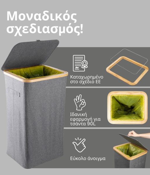 - ΚΑΙΝΟΤΟΜΟΣ ΣΧΕΔΙΑΣΜΟΣ: Το πατενταρισμένο μας πλαίσιο από μπαμπού με μεταλλικό δακτύλιο συγκρατεί με ασφάλεια τη σακούλα απορριμμάτων στη θέση της και την εμποδίζει να κρεμάσει. Το υφασμάτινο καπάκι κρύβει διακριτικά τα απορρίμματα και βοηθά να κρατήσει μακριά τις οσμές.
