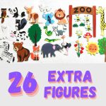 Το πακέτο περιλαμβάνει: 30 αυτοκόλλητα από τσόχα + 1 χαλάκι, 26x επιπλέον φιγούρες ζώων από τσόχα