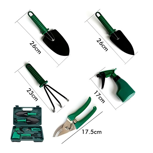 1 x Σετ εργαλείων κήπου με κουτί αποθήκευσης: 1 x δαγκάνα/τσουγκράνα ξεχορταριάσματος, 2 x κουτάλια φύτευσης, 1 x ψαλίδι κλαδέματος, 1 x ψεκαστήρας.