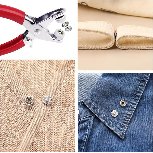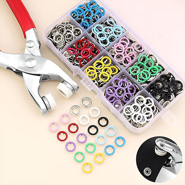 Αυτό το σετ περιλαμβάνει όλα όσα χρειάζεστε: ένα ανθεκτικό εργαλείο πένσας, 80 μεταλλικά κουμπώματα υψηλής ποιότητας σε διάφορα χρώματα και μια συμπαγή θήκη αποθήκευσης.