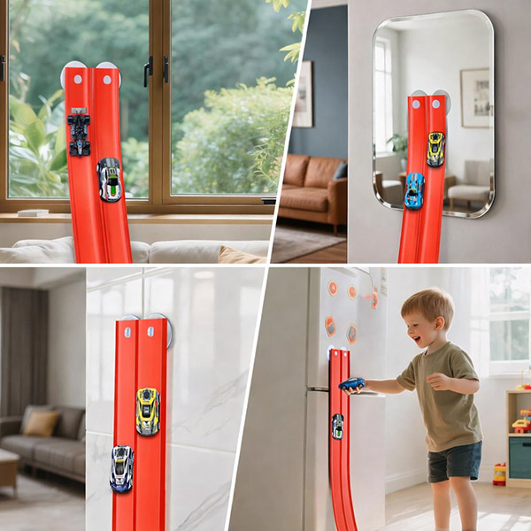 Η στερέωση με βεντούζες επιτρέπει σε παιδιά και γονείς να προσαρμόζουν γρήγορα τις γωνίες και τις διατάξεις, ώστε η πίστα να μπορεί να ξαναχτιστεί πολλές φορές χωρίς εργαλεία ή περίπλοκη εγκατάσταση.