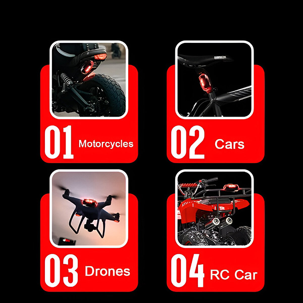 Αυτά τα φώτα είναι απίστευτα ευέλικτα και έχουν σχεδιαστεί για να ταιριάζουν σε αυτοκίνητα, μοτοσικλέτες, ποδήλατα και drones. Επιλέξτε ανάμεσα στις μεθόδους εγκατάστασης με Velcro και ελαστικό δακτύλιο για μια ασφαλή και απλή εγκατάσταση. Δεν υπάρχει ανάγκη για πολύπλοκα εργαλεία ή επαγγελματική βοήθεια.