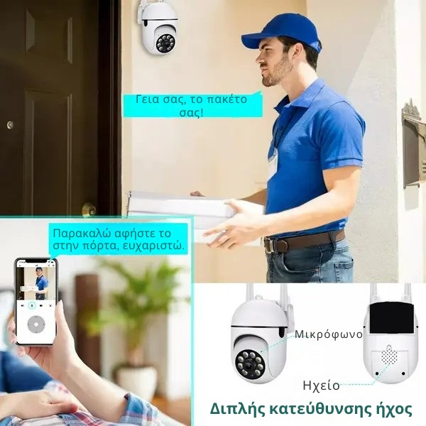 Η κάμερα ασφαλείας εξωτερικού χώρου διαθέτει ενσωματωμένο μικρόφωνο, το οποίο σας επιτρέπει να λαμβάνετε ήχο και να μιλάτε μέσω της εφαρμογής μας. Ο αμφίδρομος ήχος σάς επιτρέπει να επικοινωνείτε με τους καλεσμένους σας, ενώ το σύστημα ανίχνευσης κίνησης σάς βοηθά να απαλλαγείτε γρήγορα από ανεπιθύμητους επισκέπτες ή ζώα.