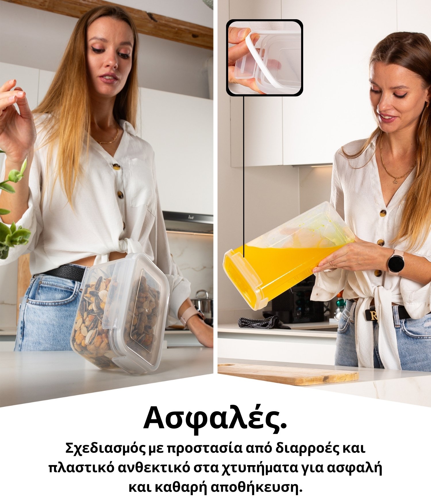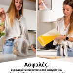 Χάρη στη σιλικόνη στο εσωτερικό του καπακιού, το δοχείο είναι απόλυτα αεροστεγές. Επομένως, υγρά ή χυμοί μέσα στο δοχείο δεν μπορούν να διαρρεύσουν ή να χυθούν, ακόμα και όταν μετακινείτε τα δοχεία, και τα τρόφιμα παραμένουν φρέσκα για περισσότερο.