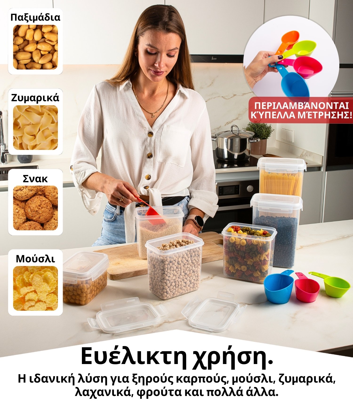 - ΠΕΡΙΣΣΟΤΕΡΗ ΤΑΞΗ – Τέλος στο χάος στο ντουλάπι. Αυτά τα στοιβαζόμενα δοχεία είναι η ιδανική λύση για την αποθήκευση διαφόρων τροφίμων, όπως δημητριακά, ξηροί καρποί, μπισκότα και ζυμαρικά.