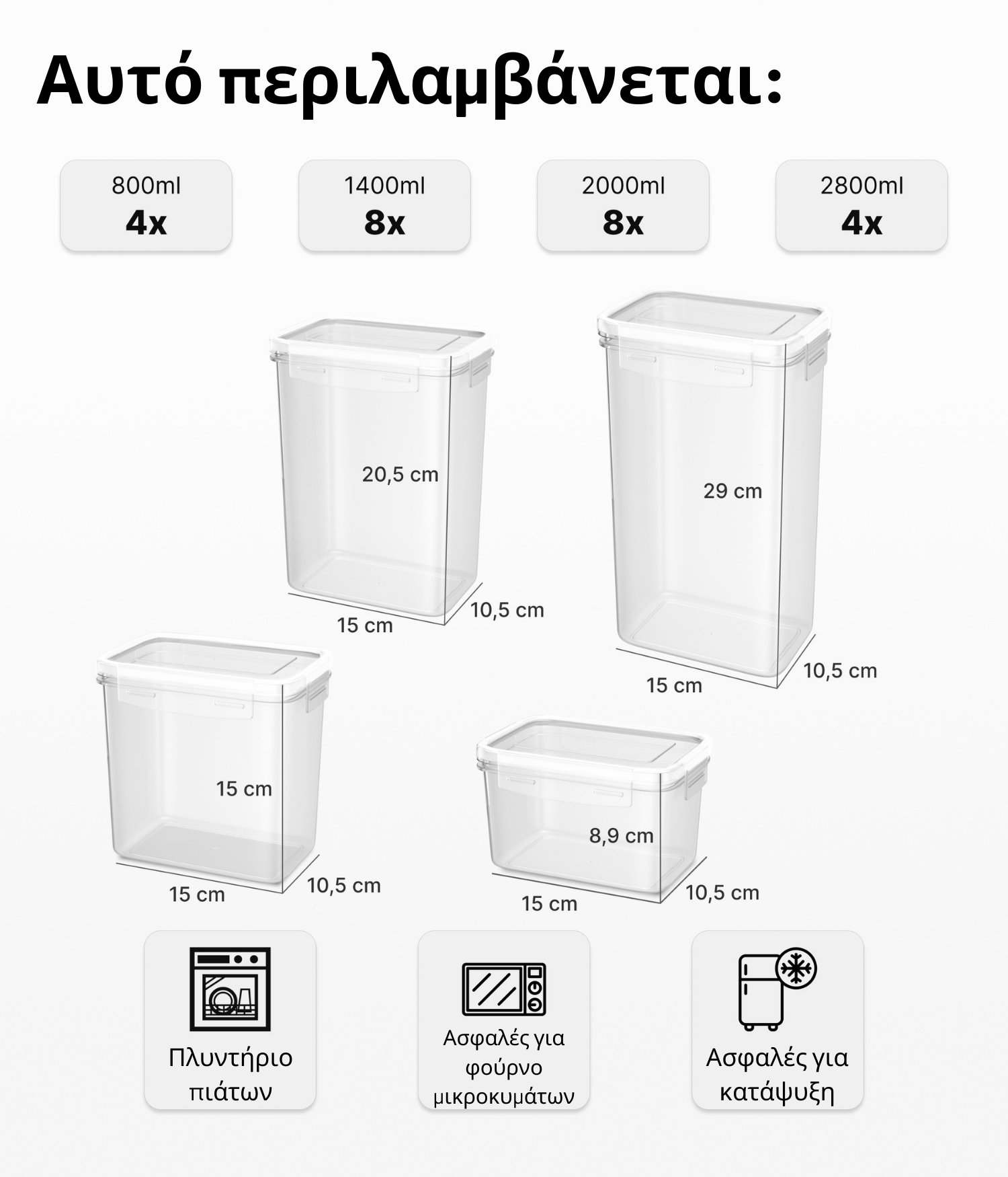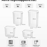 Το σετ 24 τεμαχίων περιέχει μια ποικιλία πλαστικών δοχείων σε διαφορετικά μεγέθη για διαφορετικές ανάγκες στην κουζίνα. Σε κάθε πακέτο θα λάβετε 4 τεμάχια από τα δοχεία μας των 2,8 λίτρων, 8 τεμάχια από τα δοχεία μας των 2 λίτρων, 8 τεμάχια από τα δοχεία μας των 1,4 λίτρων και άλλα 4 τεμάχια από τα μικρότερα δοχεία μας των 0,8 λίτρων. Από τώρα και στο εξής, η κουζίνα σας θα τακτοποιηθεί μόνη της!