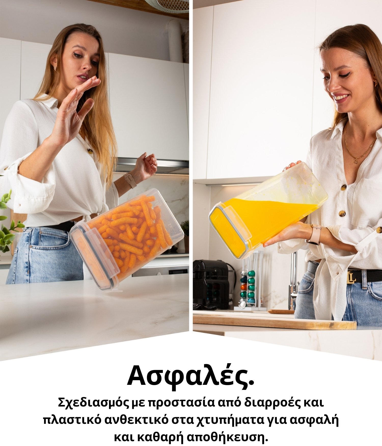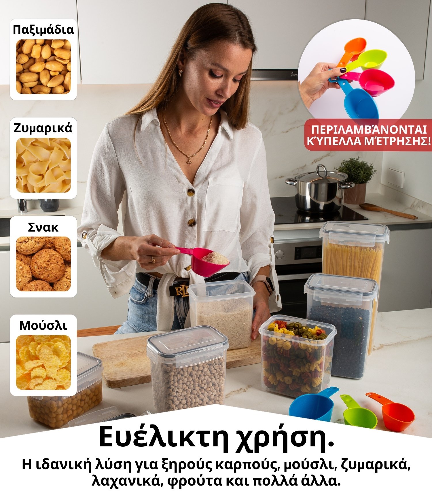 Το σετ μας είναι ιδανικό για την αποθήκευση σνακ, όπως γλυκίσματα, γκρανόλα, ξηρούς καρπούς και μπισκότα, βασικών τροφίμων όπως το αλεύρι, και τροφίμων για πρωινό, όπως ο καφές. Η αποθήκευση σε αυτά τα διαφανή δοχεία είναι εύκολη, τα τρόφιμα θα είναι καλά οργανωμένα και πάντα στη διάθεσή σας. Ποτέ ξανά δεν θα ξεχάσετε πού έχετε αποθηκεύσει κάτι!