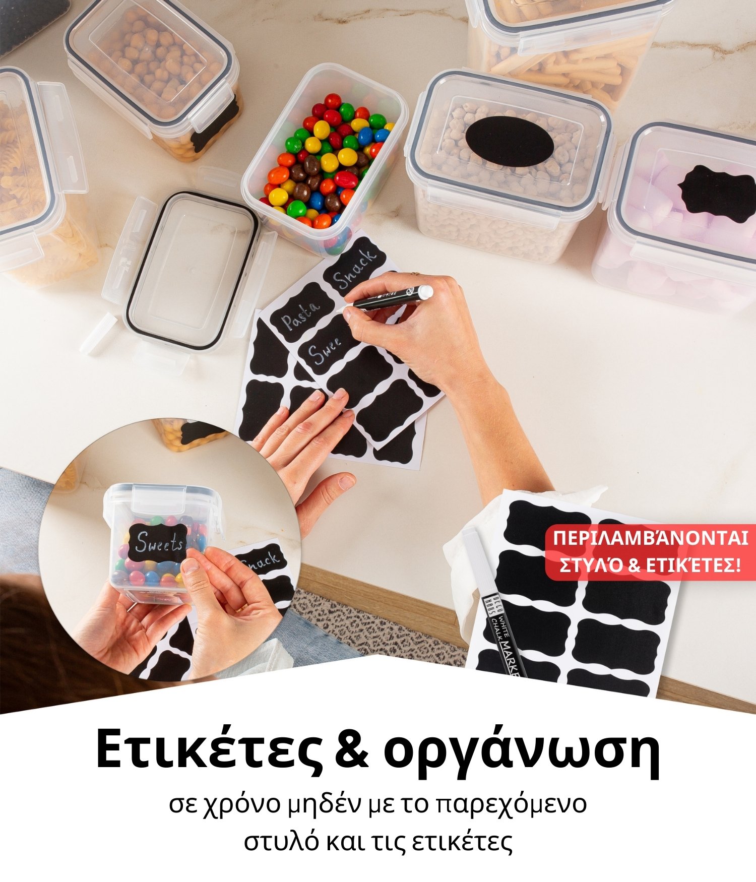 Με την αγορά, θα λάβετε επιπλέον προϊόντα που θα προσθέσουν αξία και θα συμβάλουν στην καλύτερη οργάνωση της κουζίνας σας. Σε κάθε σετ περιλαμβάνονται επαναχρησιμοποιήσιμες ετικέτες και ένα υψηλής ποιότητας στυλό, με το οποίο θα γράφετε εύκολα ό,τι χρειάζεστε πάνω τους. Θα λάβετε επίσης περισσότερα μεζούρες που θα σας βοηθήσουν στο μαγείρεμα.