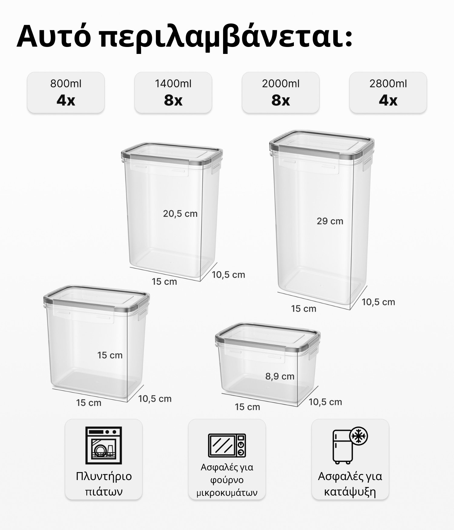 📦 Περιλαμβάνει 4×2.8L, 8x2L, 8×1.4L και 4×0.8L για ευέλικτη αποθήκευση