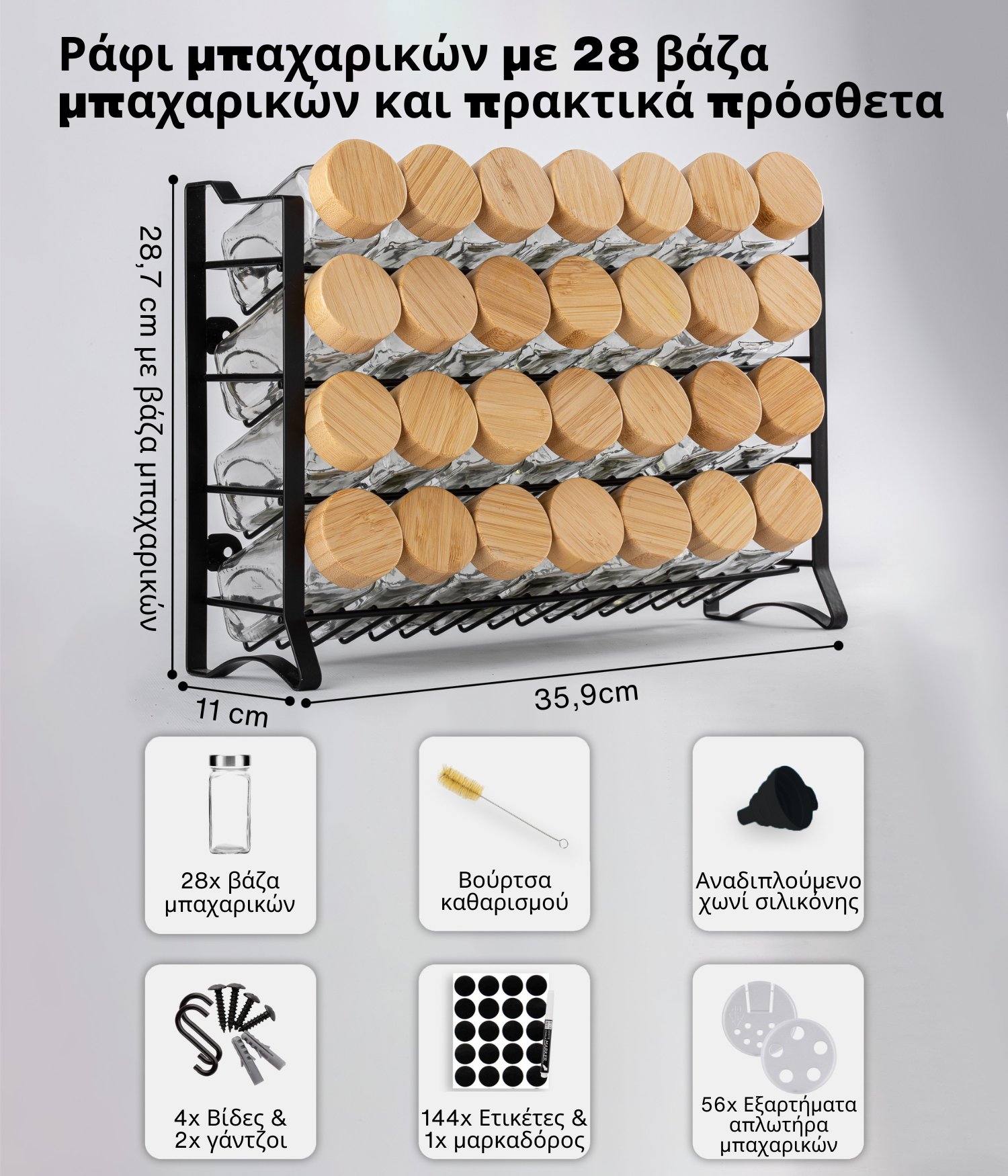 ίτε χρησιμοποιείτε μόνο μερικά από τα αγαπημένα σας μπαχαρικά στη μαγειρική σας, είτε σας αρέσει να αναμειγνύετε και να συνδυάζετε διαφορετικούς τύπους μπαχαρικών, εδώ θα βρείτε τη λύση που σας ταιριάζει! Αποθηκεύστε όλα τα μπαχαρικά σας σε 28 ξεχωριστά βάζα. Με αυτό το ράφι οργάνωσης τεσσάρων επιπέδων, μπορείτε να τακτοποιήσετε τα μπαχαρικά σας όπως θέλετε. Τα βάζα είναι κατασκευασμένα από διαφανές γυαλί, ώστε να μη χρειάζεται να μαντεύετε τι έχουν μέσα ή να ελέγχετε αν μπορεί να σας έχουν τελειώσ