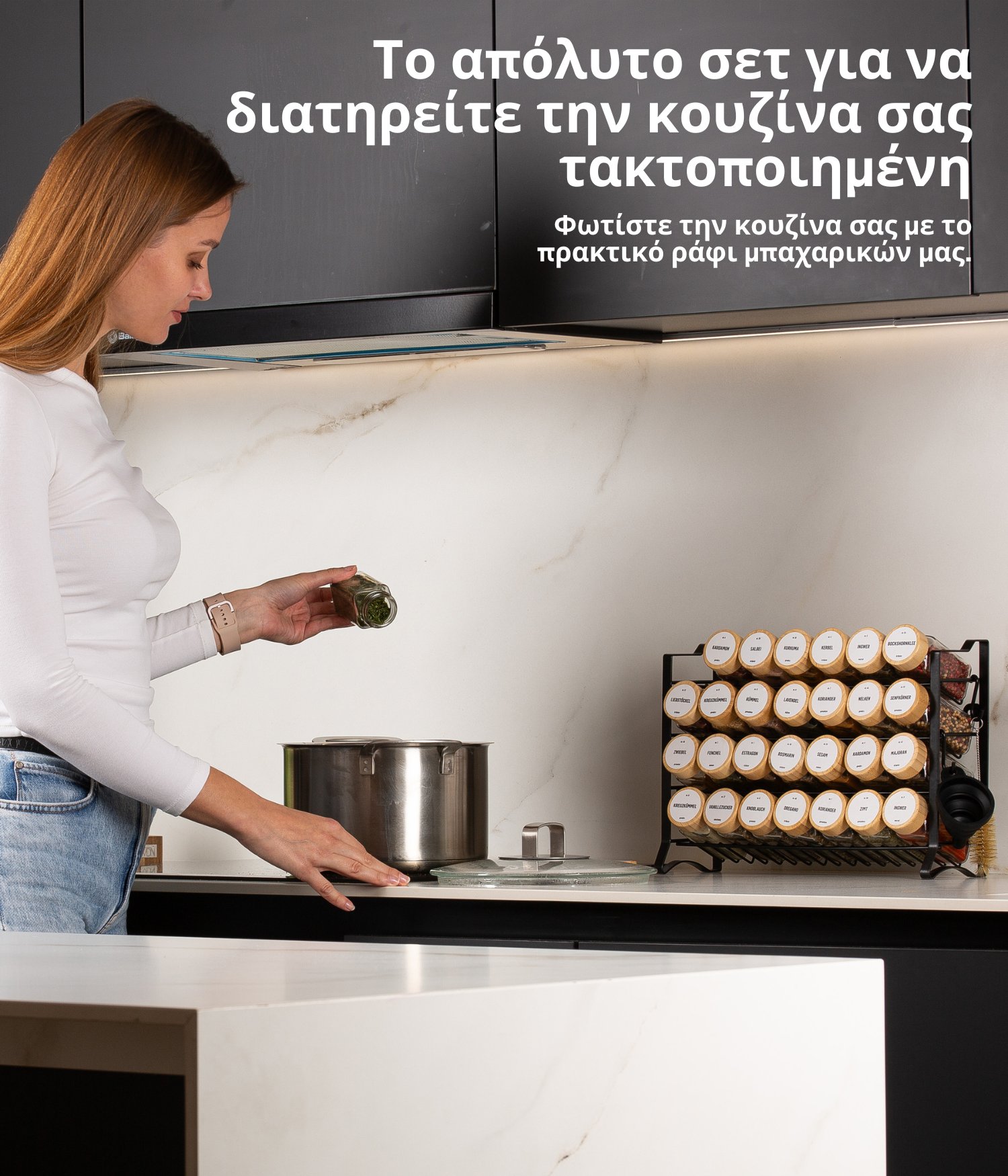 - Οργανώστε την κουζίνα σας – αυτό το σετ περιλαμβάνει ένα ράφι μπαχαρικών, αυτοκόλλητα μαξιλαράκια, 28 βάζα, 144 ετικέτες, ένα πινέλο, ένα στυλό κιμωλίας, δύο καπάκια σέικερ, ένα χωνί, γάντζους και υλικό στερέωσης.