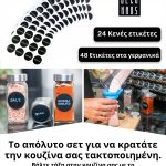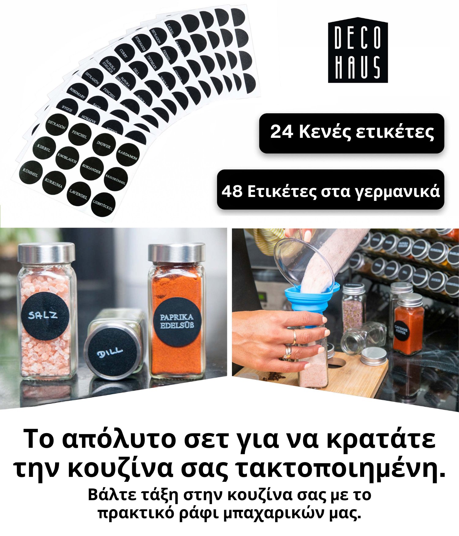 🫙 Περιλαμβάνει 48 ετικέτες, στυλό κιμωλίας και χωνί.