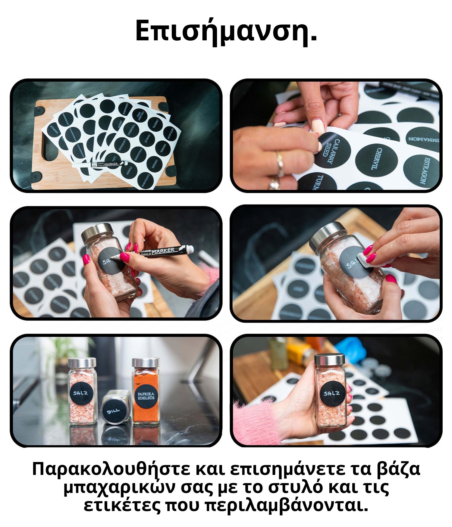 Με τον παρεχόμενο μαρκαδόρο κιμωλίας μπορείτε να δημιουργήσετε αυτοκόλλητα προσαρμοσμένα στις ανάγκες σας. Εάν θέλετε να διορθώσετε ή να διαγράψετε κάτι, απλά σκουπίστε τα με ένα υγρό πανί. Έτσι, δεν θα μπερδέψετε ποτέ ξανά το αλάτι με τη ζάχαρη!