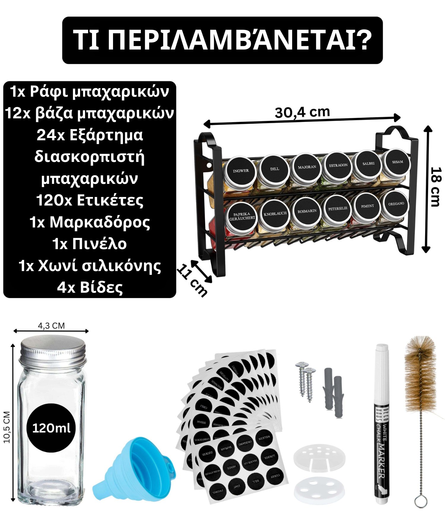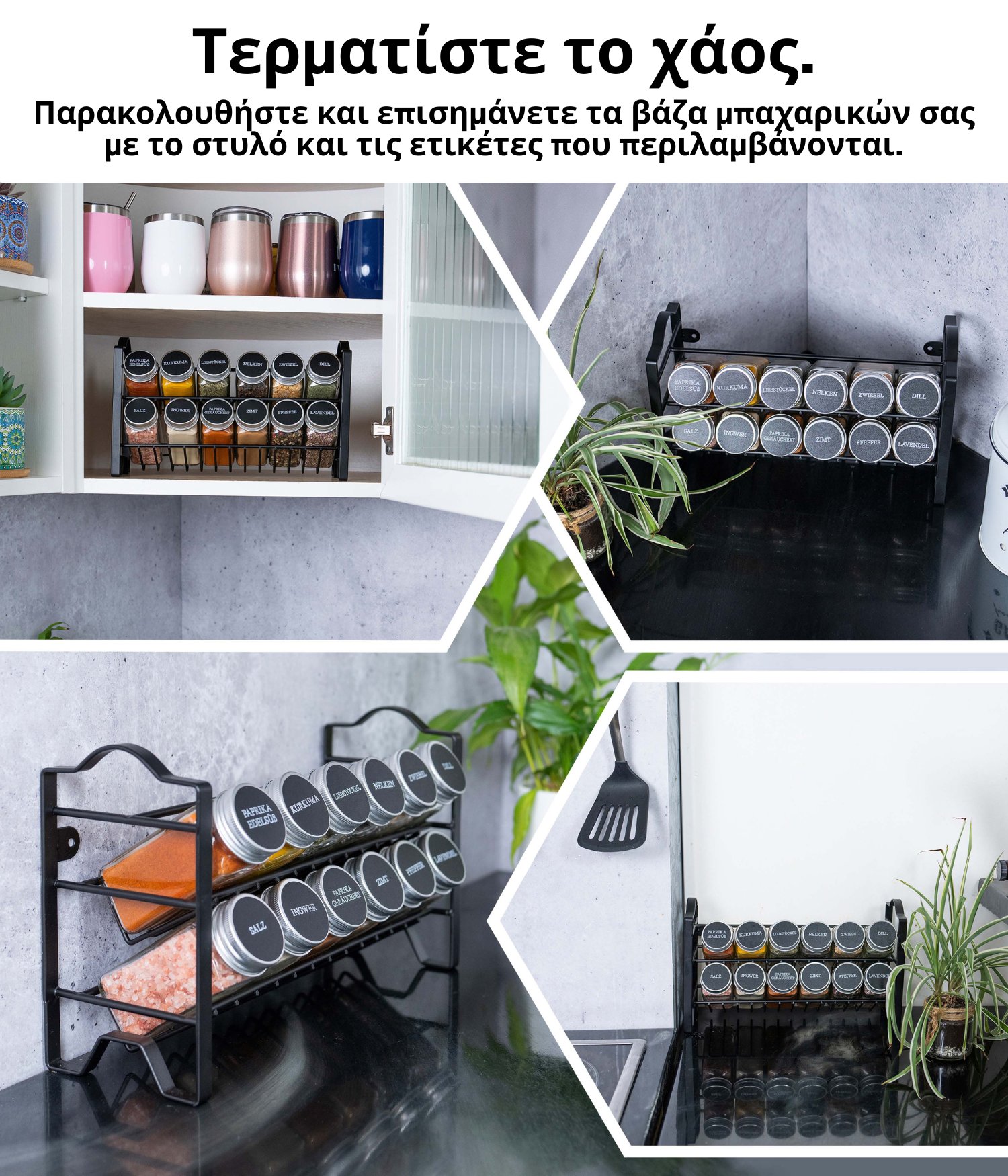 - Οργανώστε την κουζίνα σας – αυτό το σετ περιλαμβάνει ένα ράφι μπαχαρικών, αυτοκόλλητα μαξιλαράκια, 12 βάζα, 48 ετικέτες, ένα πινέλο, ένα στυλό κιμωλίας, δύο καπάκια σέικερ, ένα χωνί και υλικό στερέωσης.