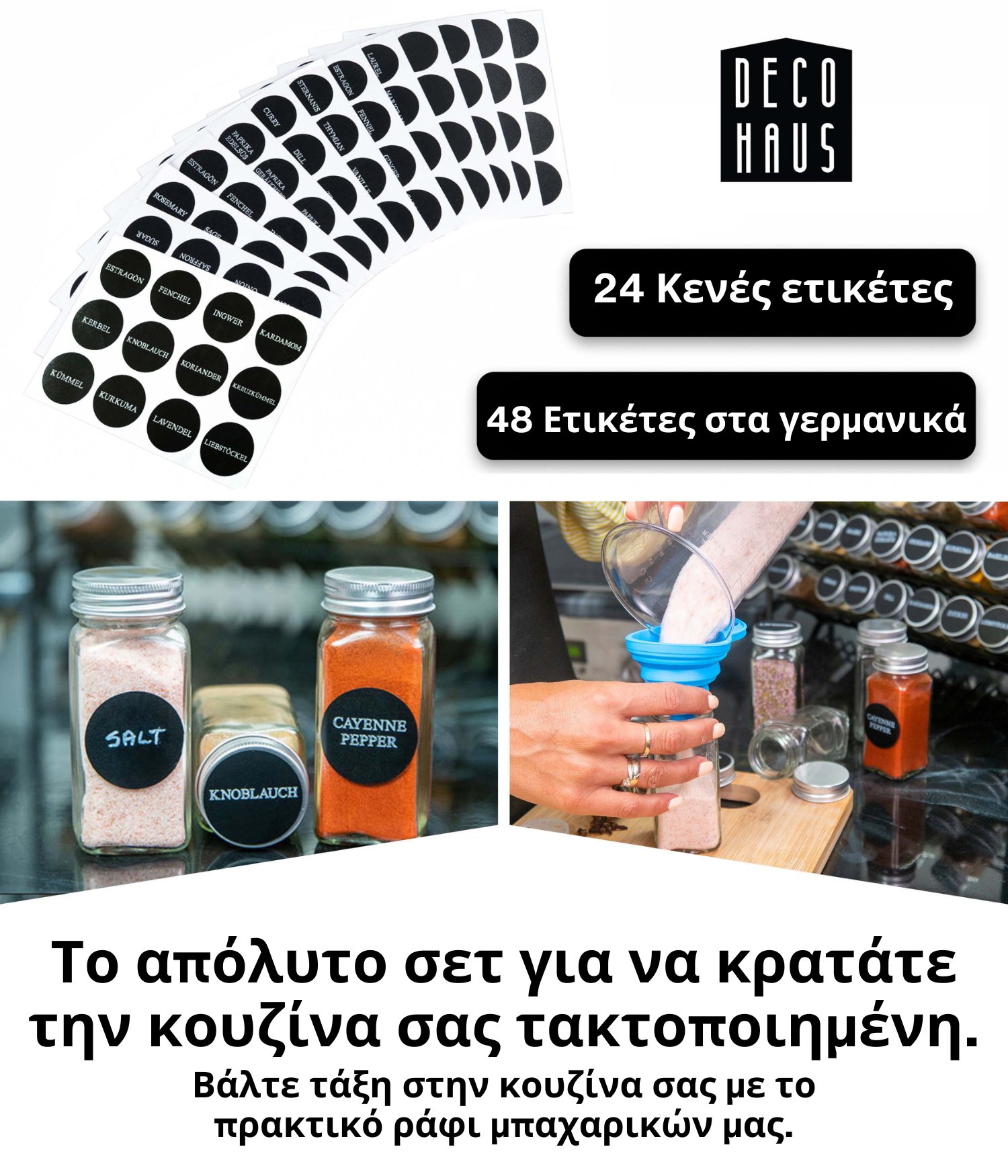 🫙 Περιλαμβάνει 48 ετικέτες, στυλό κιμωλίας και χωνί.