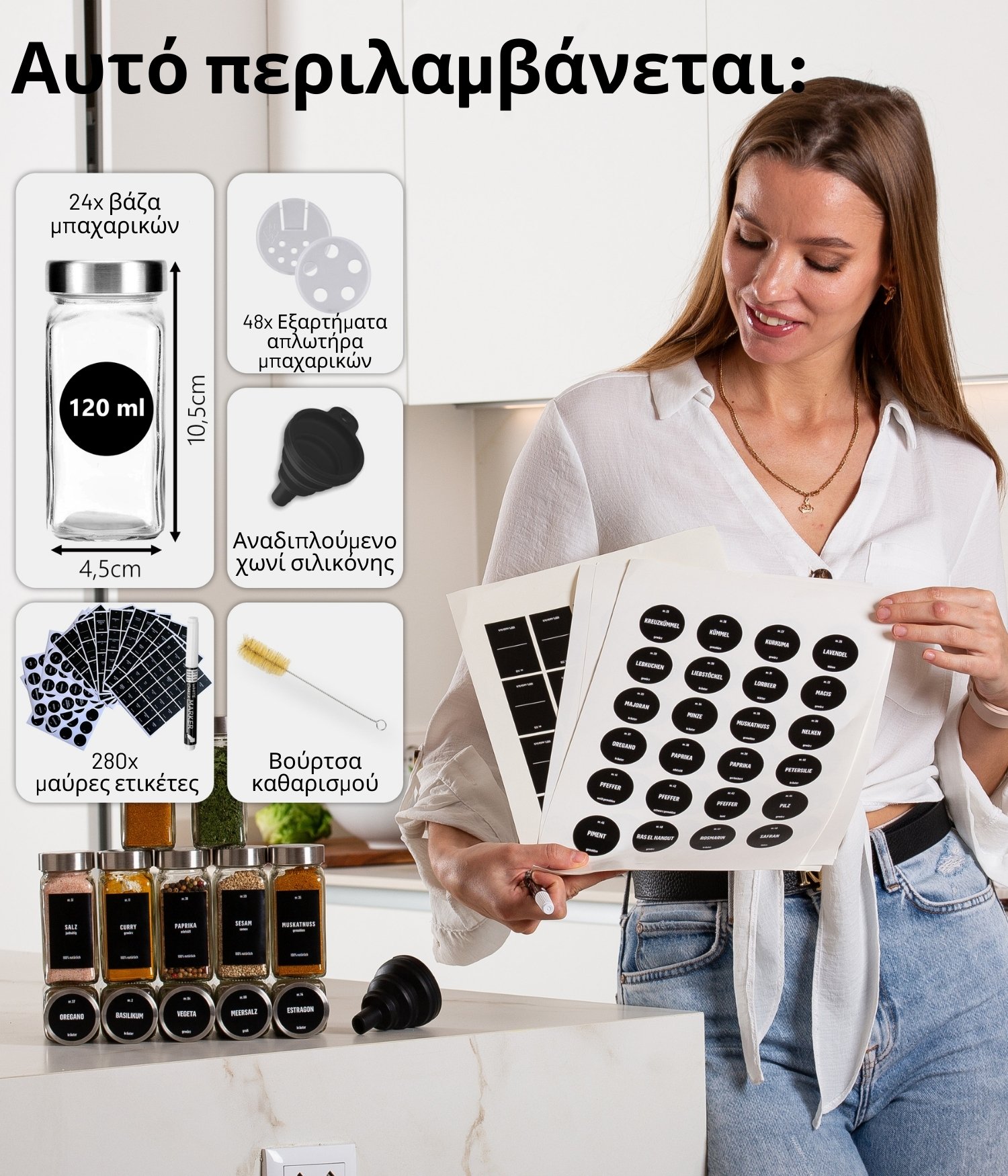 Το σετ μας περιλαμβάνει 24 ίσα γυάλινα βάζα μπαχαρικών με πρακτικά βιδωτά καπάκια. Από εδώ και πέρα, μπορείτε να εκθέσετε περήφανα τα μπαχαρικά σας, δίνοντας στην κουζίνα σας μια ιδιαίτερη γοητεία!