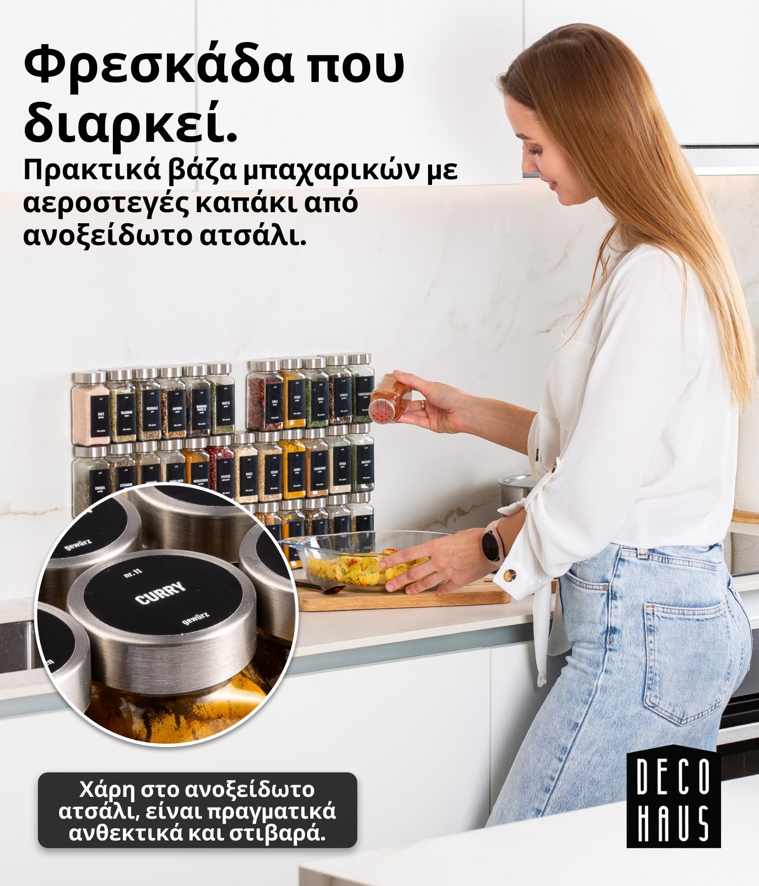 Μπορείτε να το τοποθετήσετε στον πάγκο ή να το κρεμάσετε στον τοίχο. Με αυτό, θα έχετε τέλεια εικόνα όλων των μπαχαρικών, και σε συνδυασμό με τα βάζα μπαχαρικών, θα δώσει στην κουζίνα σας μια ιδιαίτερη γοητεία!