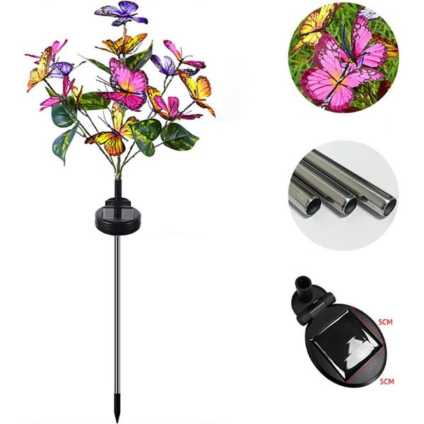 Με ζωντανές υφασμάτινες πεταλούδες και πολύχρωμα LED φωτάκια, αυτά τα ηλιακά φώτα κήπου είναι βέβαιο ότι θα σας θαμπώσουν και θα σας ενθουσιάσουν. Προσθέστε μια μοναδική πινελιά στη διακόσμηση του κήπου σας με τον μοναδικό σχεδιασμό τους. Τα φώτα LED είναι ενεργειακά αποδοτικά και εκπέμπουν μια ζεστή, φιλόξενη λάμψη.