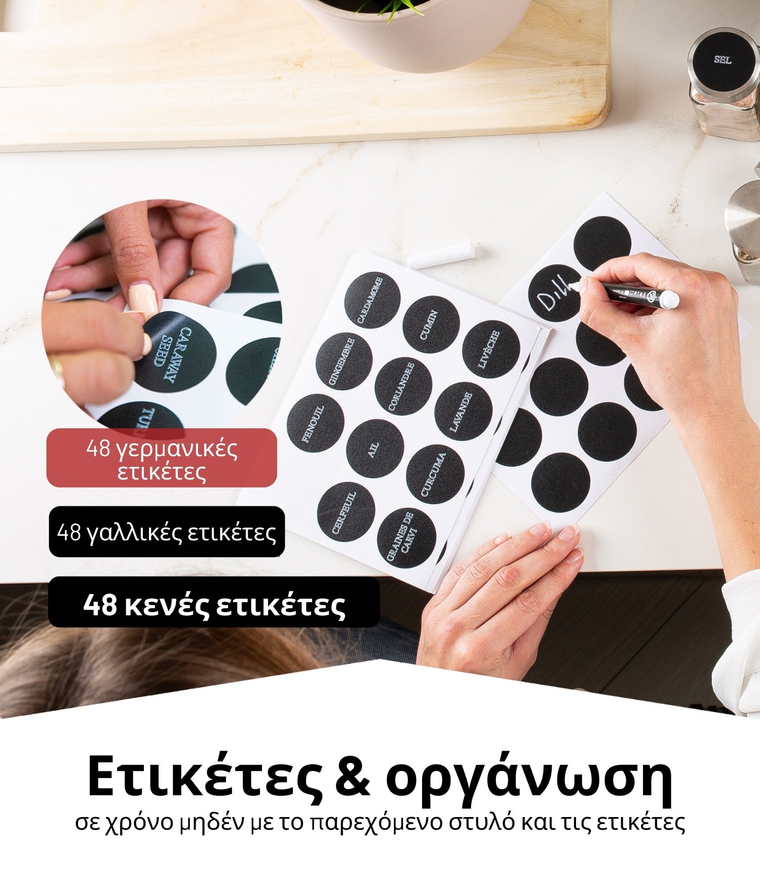 Ο οργανωτής συρταριού μπαχαρικών μας έρχεται προσυναρμολογημένος, ώστε να μπορείτε να ξεκινήσετε αμέσως την οργάνωση. Για να το κάνετε ακόμα πιο εύκολο, θα λάβετε 280 ετικέτες στο σετ, 200 από τις οποίες είναι προ-εκτυπωμένες. Οι υπόλοιπες 80 αυτοκόλλητες ετικέτες είναι κενές, ιδανικές για σπιτικά μπαχαρικά και μείγματα.