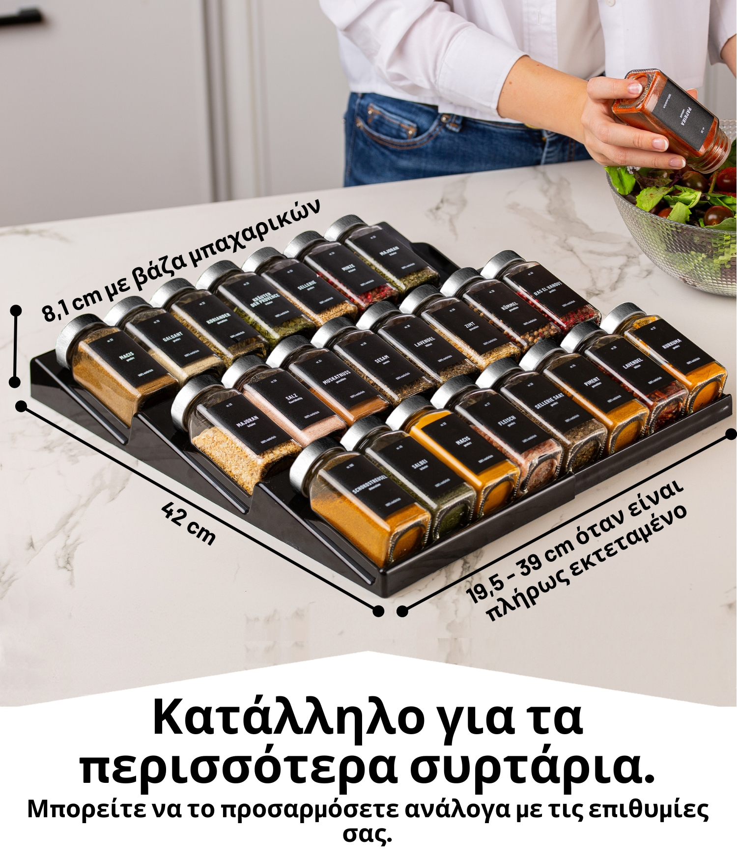 - ΠΡΟΣΑΡΜΟΣΜΕΝΟ ΠΛΑΤΟΣ: Με διαστάσεις 19,5 x 42 εκ., η βάση μπαχαρικών ταιριάζει καλά σε τυπικά συρτάρια κουζίνας και μπορεί να επεκταθεί έως 39 εκ. αν χρειαστεί.
