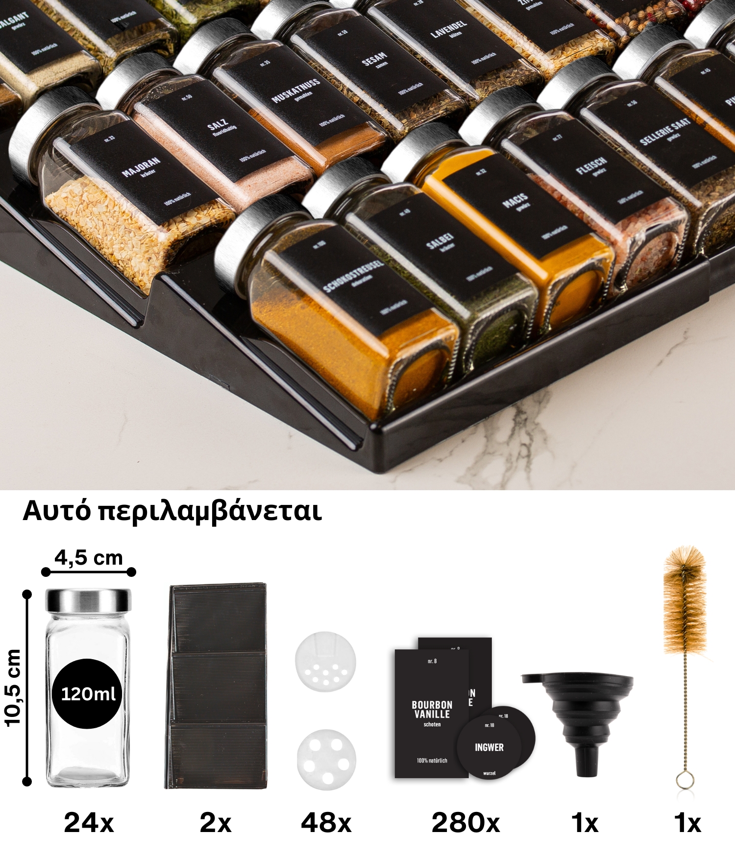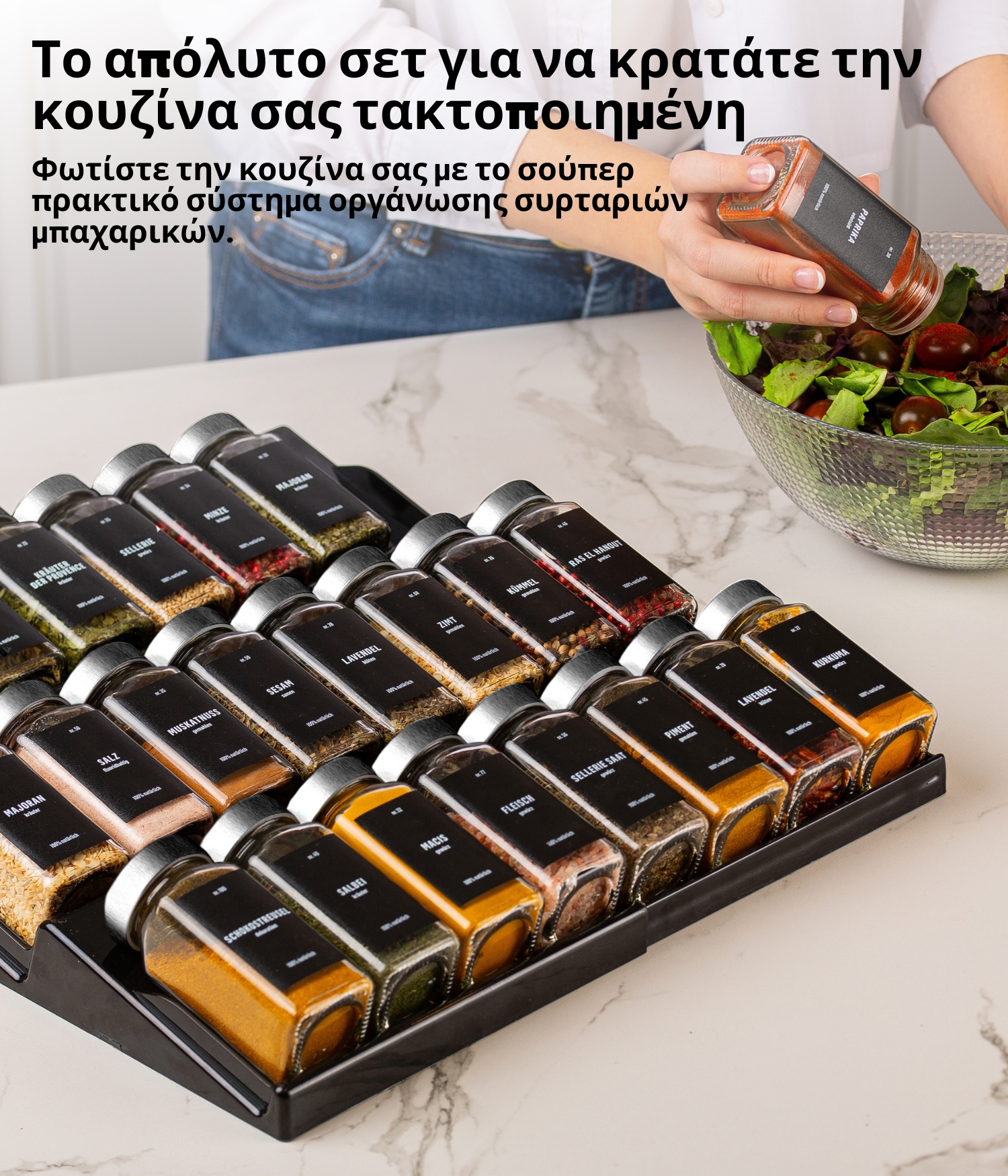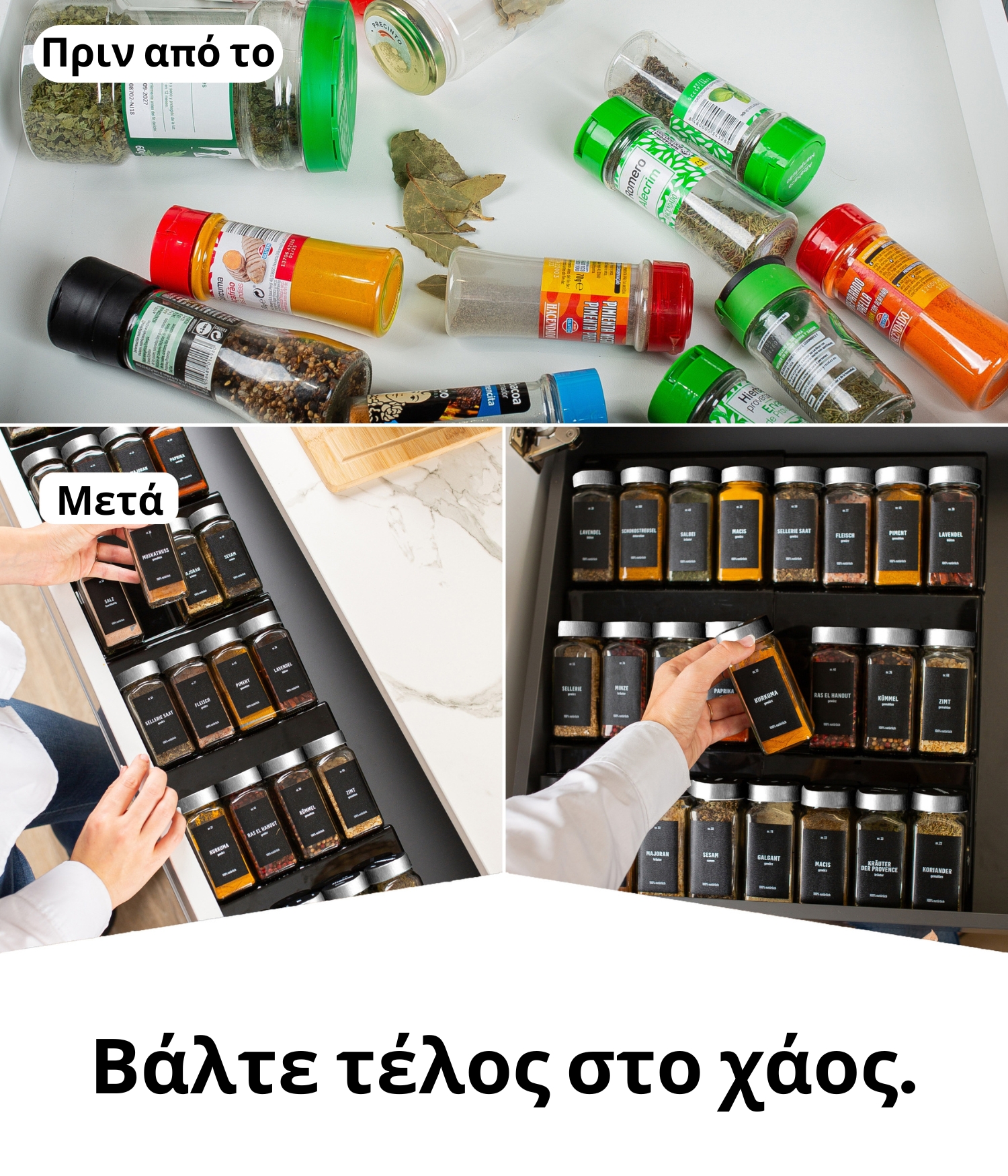 Είτε χρησιμοποιείτε μόνο μερικά από τα αγαπημένα σας μπαχαρικά στη μαγειρική σας, είτε σας αρέσει να συνδυάζετε διαφορετικά είδη μπαχαρικών, εδώ θα βρείτε τη λύση που σας ταιριάζει! Αποθηκεύστε όλα τα μπαχαρικά σας σε 24 ξεχωριστά βάζα. Τα βάζα είναι κατασκευασμένα από διαφανές γυαλί, ώστε να μη χρειάζεται να μαντεύετε τι περιέχουν ή να ελέγχετε αν μπορεί να σας έχουν τελειώσει.