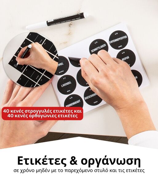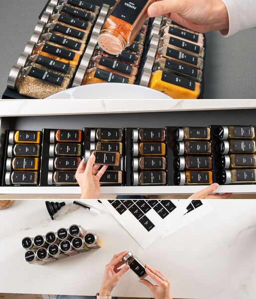 Ο οργανωτής συρταριού μπαχαρικών μας έρχεται προσυναρμολογημένος, ώστε να μπορείτε να ξεκινήσετε αμέσως την οργάνωση. Για να το κάνετε ακόμα πιο εύκολο, θα λάβετε 280 ετικέτες στο σετ, 200 από τις οποίες είναι προ-εκτυπωμένες. Οι υπόλοιπες 80 αυτοκόλλητες ετικέτες είναι κενές, ιδανικές για σπιτικά μπαχαρικά και μείγματα.