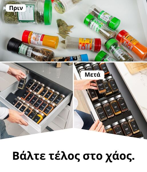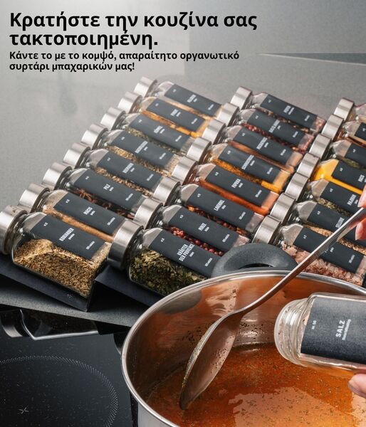 Είτε χρησιμοποιείτε μόνο μερικά από τα αγαπημένα σας μπαχαρικά στη μαγειρική σας, είτε σας αρέσει να συνδυάζετε διαφορετικά είδη μπαχαρικών, εδώ θα βρείτε τη λύση που σας ταιριάζει! Αποθηκεύστε όλα τα μπαχαρικά σας σε 24 ξεχωριστά βάζα. Τα βάζα είναι κατασκευασμένα από διαφανές γυαλί, ώστε να μη χρειάζεται να μαντεύετε τι περιέχουν ή να ελέγχετε αν μπορεί να σας έχουν τελειώσει.