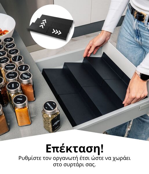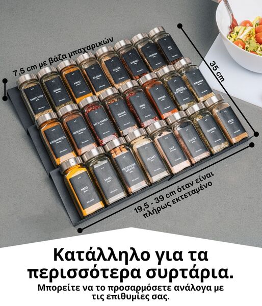 - ΠΡΟΣΑΡΜΟΣΜΕΝΟ ΠΛΑΤΟΣ: Με διαστάσεις 19,5 x 35 εκ., η βάση μπαχαρικών ταιριάζει καλά σε τυπικά συρτάρια κουζίνας και μπορεί να επεκταθεί έως 39 εκ. αν χρειαστεί.