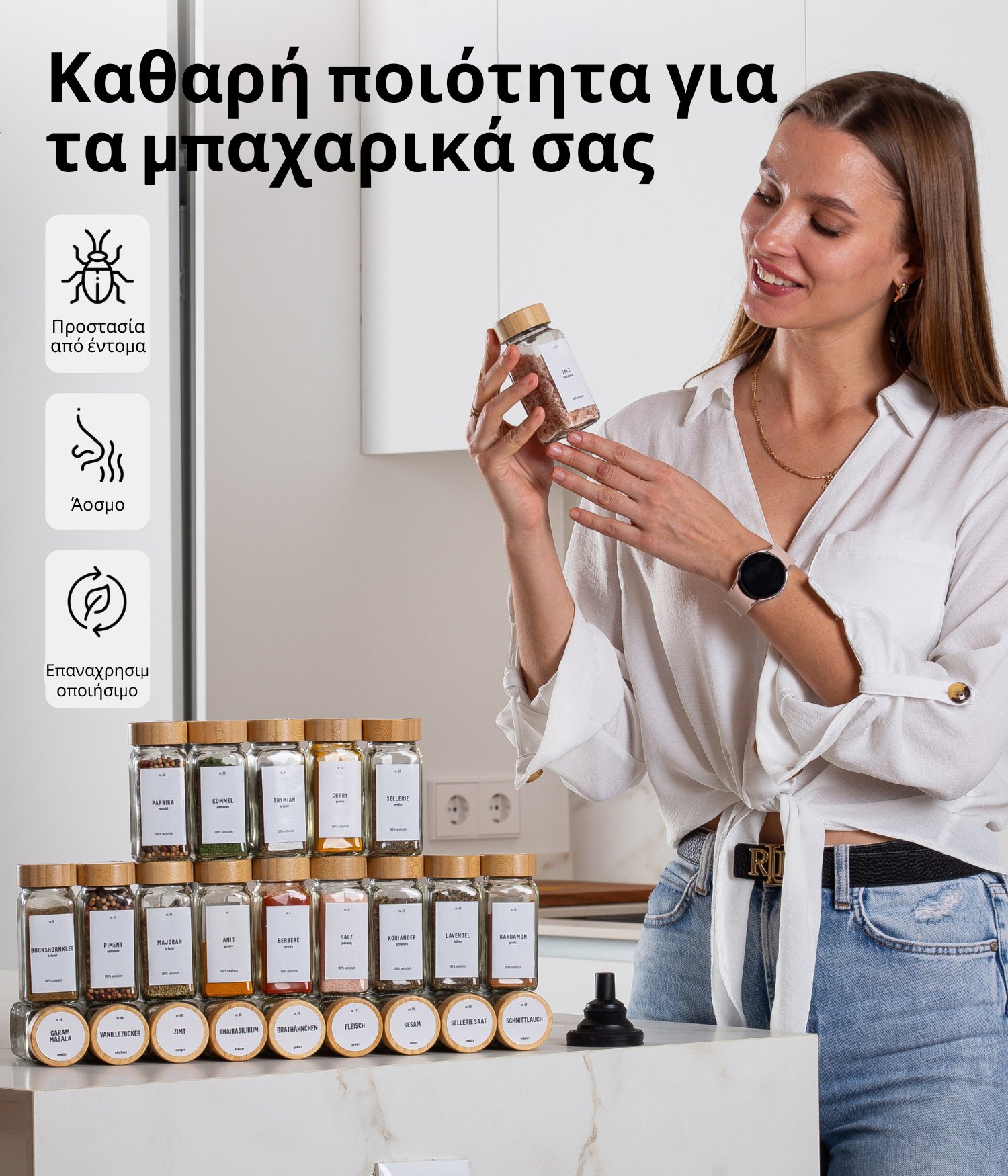 - ΕΠΙΣΗΜΑΝΕΤΕ ΤΑ ΜΠΑΧΑΡΙΚΑ ΣΑΣ ΩΣ ΕΠΑΓΓΕΛΜΑΤΙΑΣ! – Το σετ βάζων μπαχαρικών με καπάκια περιλαμβάνει επίσης 200 ετικέτες στα γερμανικά με τυπωμένα τα ονόματα των πιο κοινών μπαχαρικών και 80 κενές ετικέτες.