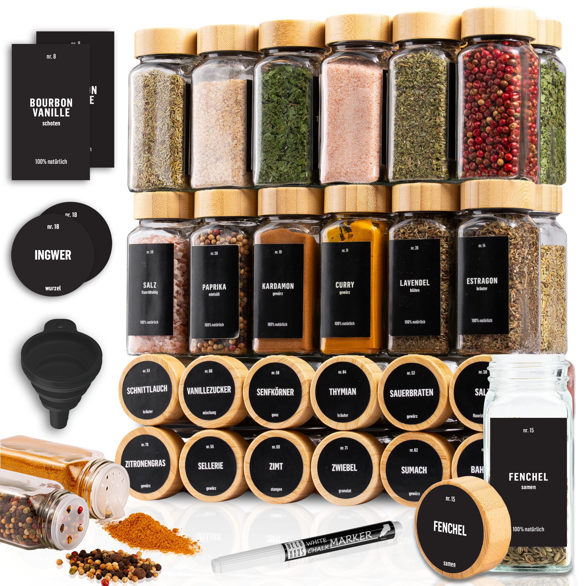 • ΕΠΙΣΗΜΑΝΕΤΕ ΤΑ ΜΠΑΧΑΡΙΚΑ ΣΑΣ ΩΣ ΕΠΑΓΓΕΛΜΑΤΙΑΣ! – Το σετ γυάλινων βάζων μπαχαρικών με καπάκια περιλαμβάνει επίσης 200 αυτοκόλλητα στα γερμανικά με τυπωμένα ονόματα των πιο συνηθισμένων μπαχαρικών και 80 κενά αυτοκόλλητα, στα οποία μπορείτε να γράψετε με το συμπεριλαμβανόμενο κιμωλίτικο στυλό.