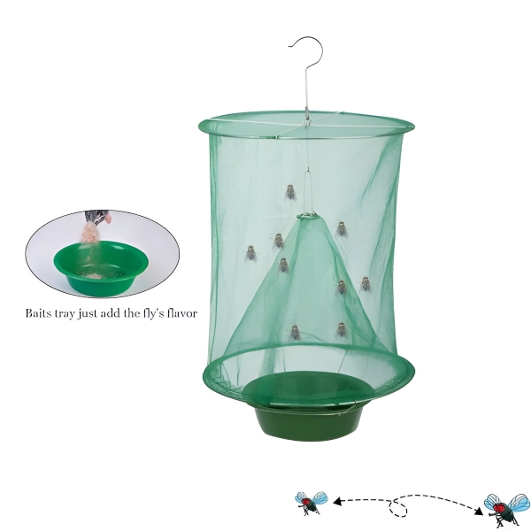 Αυτή η κρεμαστή μυγοπαγίδα είναι ακίνδυνη χωρίς τοξικά εντομοκτόνα και χημικά. Απλά πρέπει να χρησιμοποιήσετε δόλωμα για να προσελκύσετε τις μύγες και αφού μπουν στο κλουβί, θα πεθάνουν φυσικά λόγω έλλειψης τροφής. Είναι η καλύτερη επιλογή για μεγάλους εξωτερικούς χώρους όπως γκαζόν, πάρκα, αγορές, καντίνες, εστιατόρια, σφαγεία, αγροκτήματα, πράσινες ζώνες, τουαλέτες, χώρους απορριμμάτων (στο έδαφος) και άλλους δημόσιους χώρους.